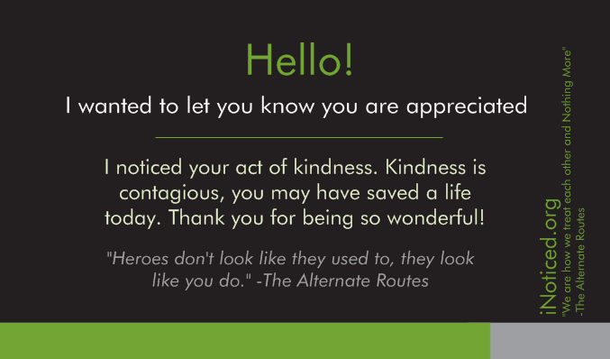 Somebody thought your act of kindness was meaningful enough to give you this card. More than likely the person you were kind to was pleased and passed on your kindness, perhaps in their own way, to someone else. The person who gave you this card was certainly pleased, and as a card holder also passed on the kindness.